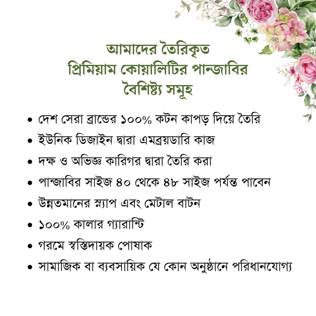 কোয়ালিটির ব্যাপারে আমরা আপোসহীন। আমাদের প্রতিটি পাঞ্জাবি সেরা মানের কাপড় এবং সুদক্ষ কারিগর দ্বারা তৈরি। ১০০% কটন কাপড়ে তৈরি এই পাঞ্জাবিগুলো আপনাকে দেবে এক নতুন অভিজ্ঞতা।
